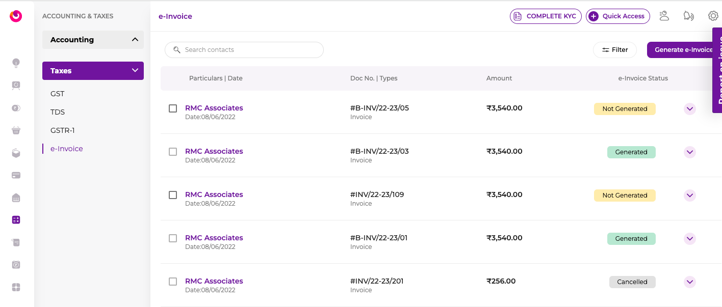Moreover, you can select single/bulk invoices tagged as 'Not Generated’ from the list and click on the ‘Generate e-Invoice’ button to generate an e-Invoice. You can click on the purple dropdown arrow in the right end of the row to view the summarised data of any ‘Generated’ e-Invoice by clicking on the purple down arrow provided in the right end of the row.